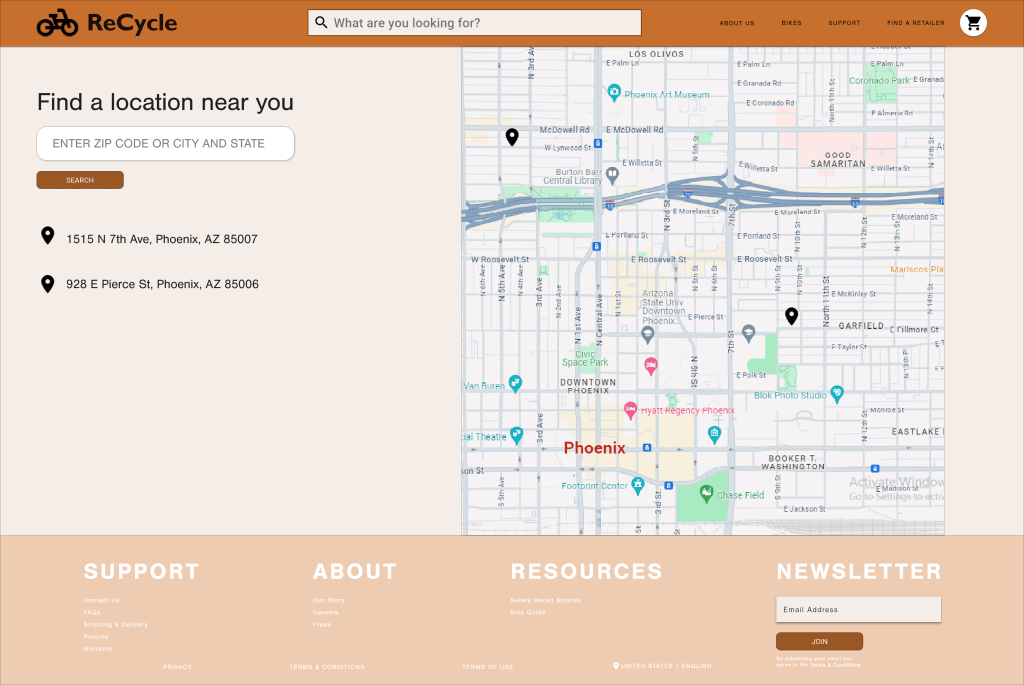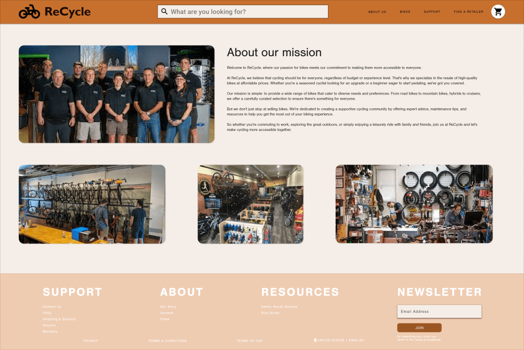 ReCycleShop.com is a website project designed for the purpose of reselling used bicycles. I came up with this idea through my love of road biking and my passion for creating a smaller carbon footprint through recycling and buying pre-owned when possible. Below are a handful of high-fidelity mockups of the project.
