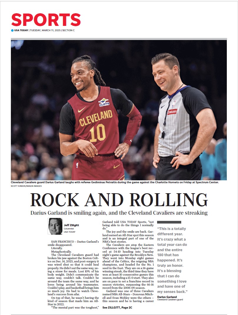 This column running in USA Today was about how the Cavaliers are surging, highlighted by guard Darius Garland’s recovery from a broken jaw and his gleeful return to the court. The headline is a play on Cleveland being home to the Rock & Roll Hall of Fame.