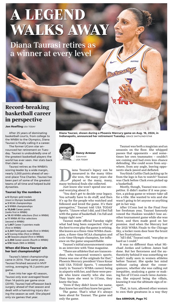 Nancy Armour wrote a column honoring the legacy of Diana Taurasi as she announced her retirement from professional basketball. An infobox dives into the extensive list of accolades Taurasi has accumulated since joining the WNBA in 2004. It was important to me to highlight her successes after two decades in the league and dominating as a well-decorated Olympian.