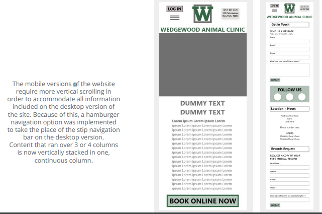 This website’s purpose is to support a user in scheduling and utilizing the veterinary clinic’s available digital resources. In addition to a traditional website for desktop use, I also built screen size variability into the design to ensure a good user experience on mobile devices as well.